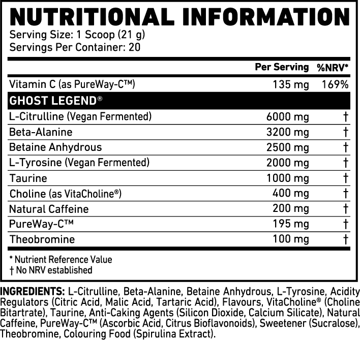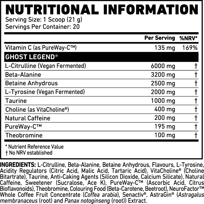 Mix 1 scoop (1 serving) of GHOST LEGEND® with 250-300 ml of water or beverage of choice. Vary amount of liquid to taste. Start with 1/2 scoop to assess your tolerance. Consume prior to exercise on training days.