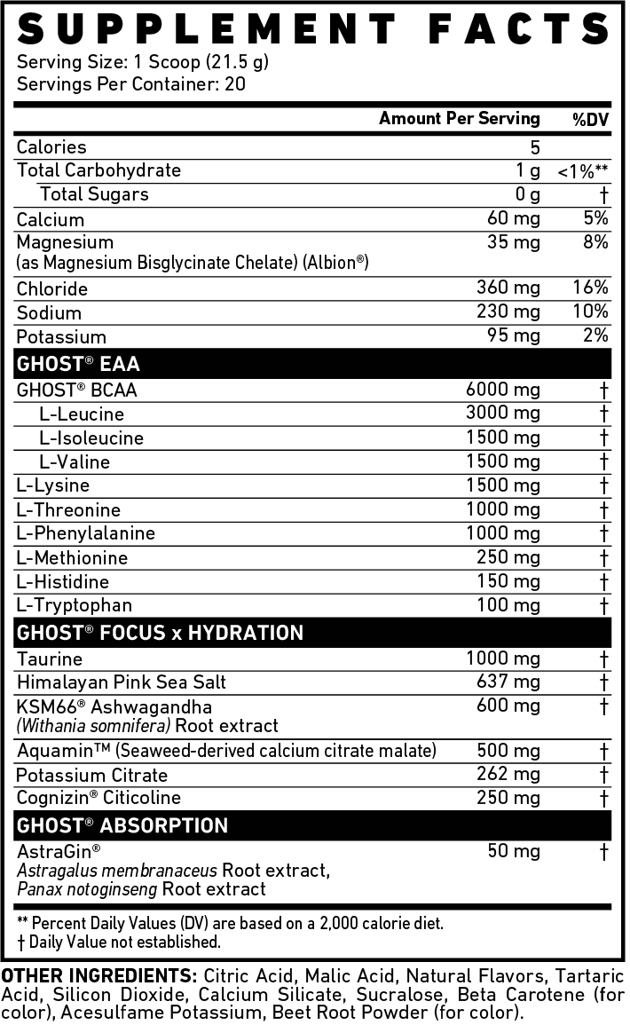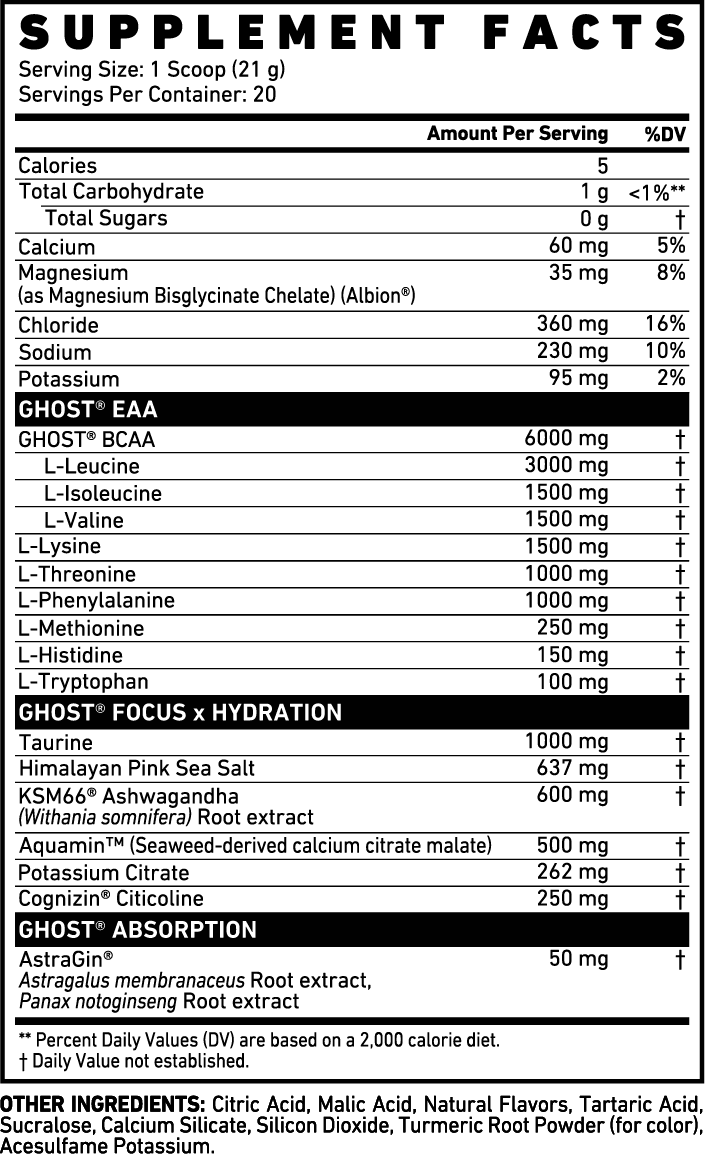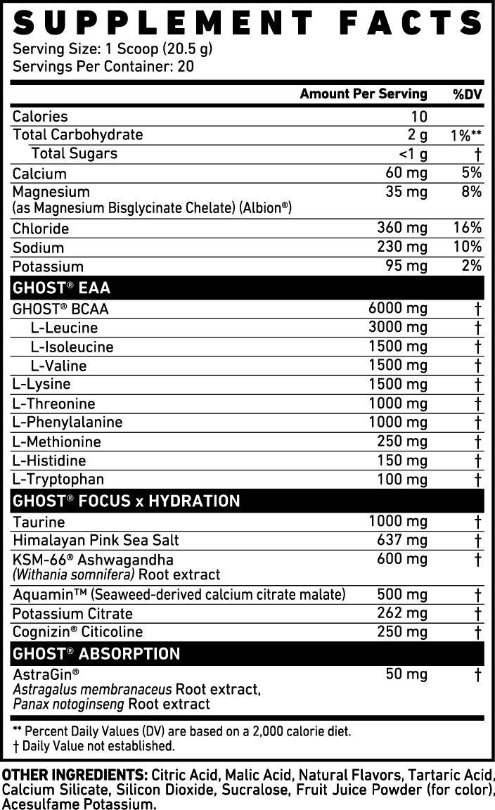 Our intra-workout POWERHOUSE. Packed with 6G of BCAAs, plus an additional 4G of other EAAs for an EPIC 10G total EAAs per serving... oh yeah, and we threw in loaded doses of Taurine, Cognizin® (Citicoline) and KSM66® Ashwagandha. Enjoy GHOST® INTRA with us around the clock. We sip ours at the gym, at the office and even with the squad before a night out.
