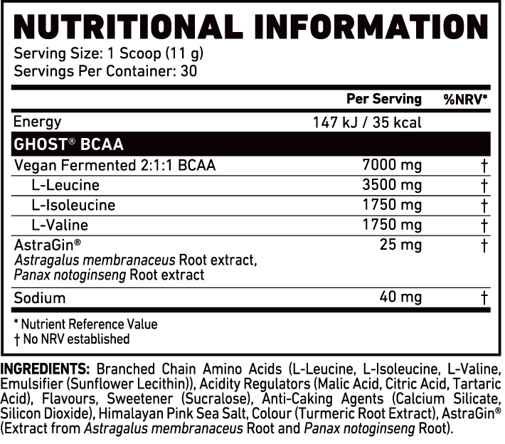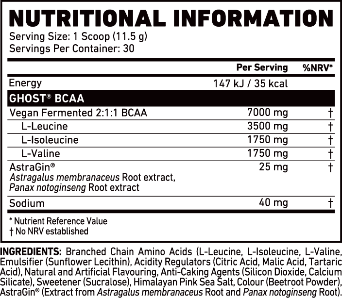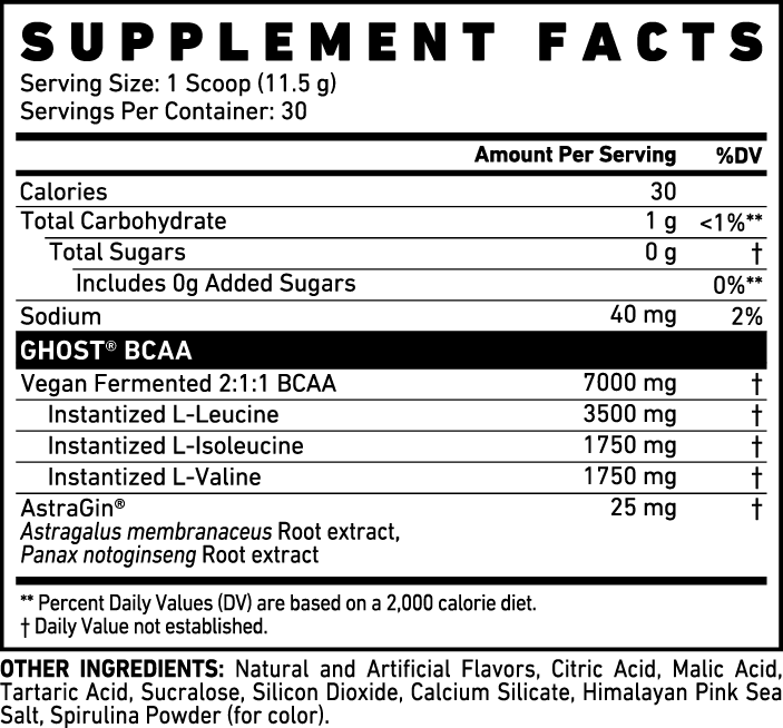 Mix each scoop (serving) of GHOST® BCAA with 250-300 ml of water or beverage of choice. Vary amount of liquid to taste. Consume during or after exercise on training days or throughout the day as a performance thirst quencher.