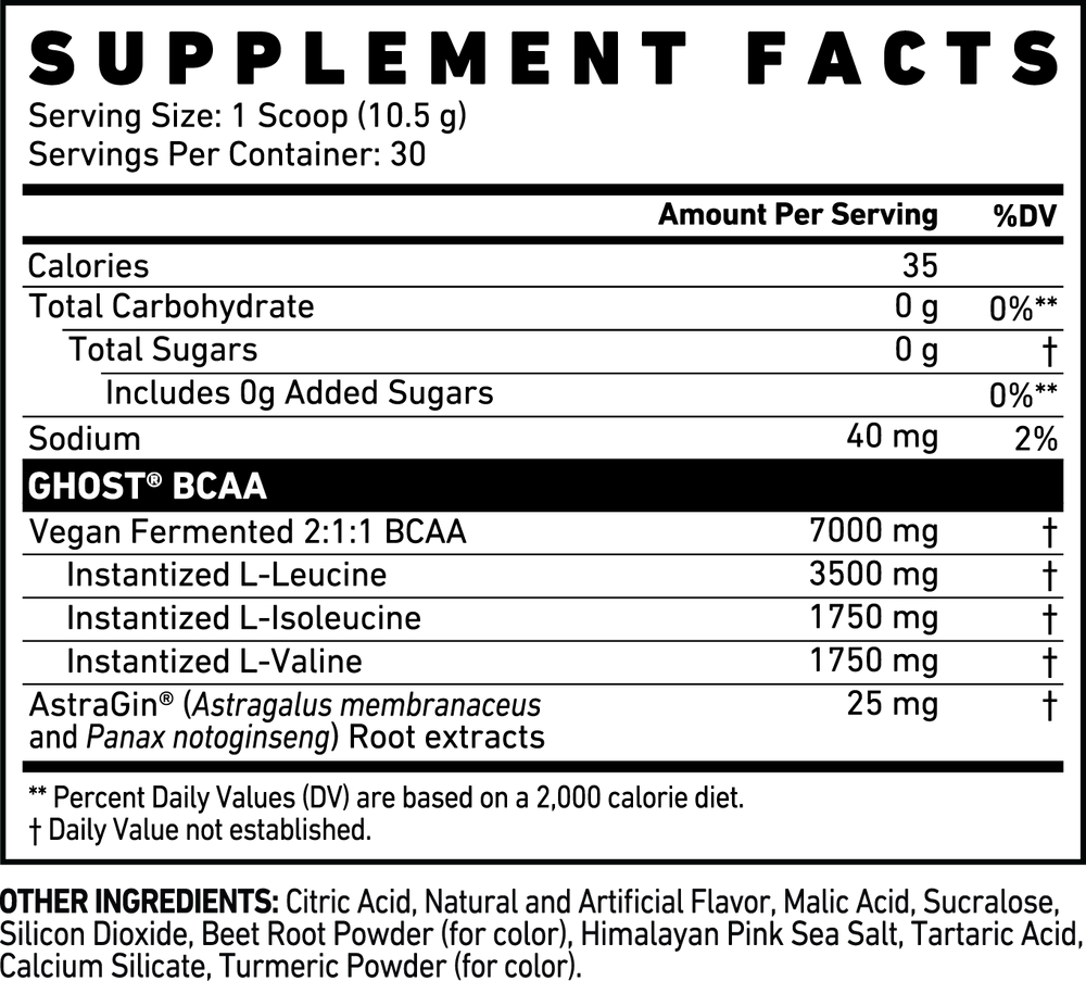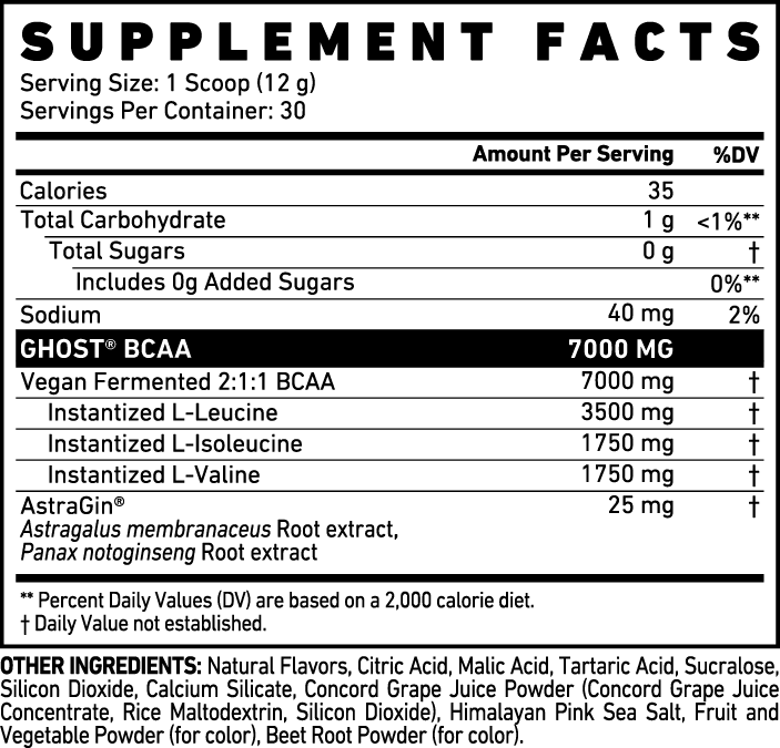 Mix each scoop (serving) of GHOST® BCAA with 250-300 ml of water or beverage of choice. Vary amount of liquid to taste. Consume during or after exercise on training days or throughout the day as a performance thirst quencher.
