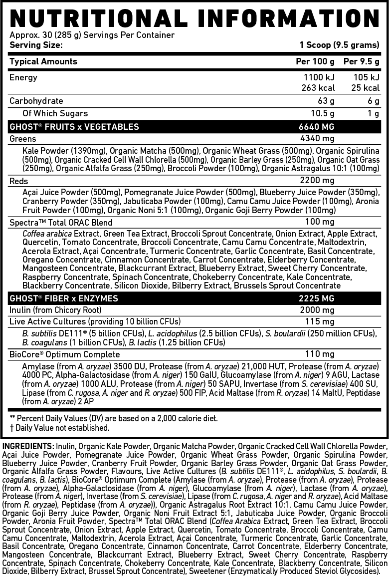 It's easier than ever to get your fruits and veggies in! GHOST® GREENS combines 19 individually sourced Greens and Reds with a full 100mg dose of Spectra™, Prebiotics, 10 billion CFUs Probiotic and the super-premium BioCore® Optimum Complete Digestive Enzymes.