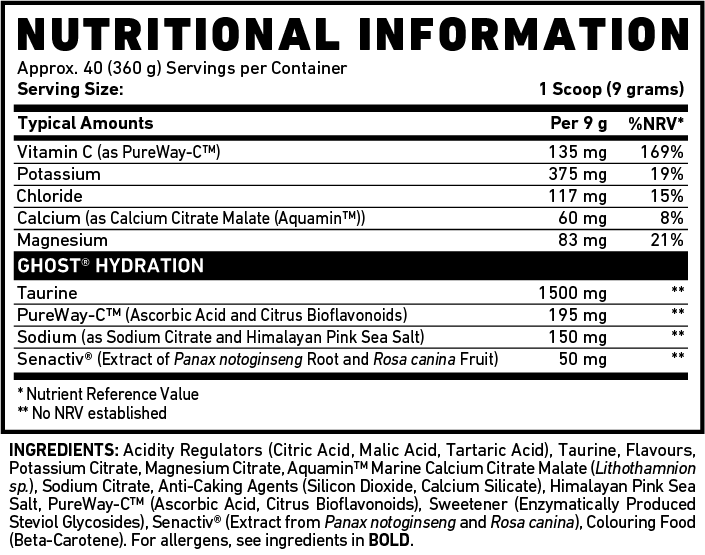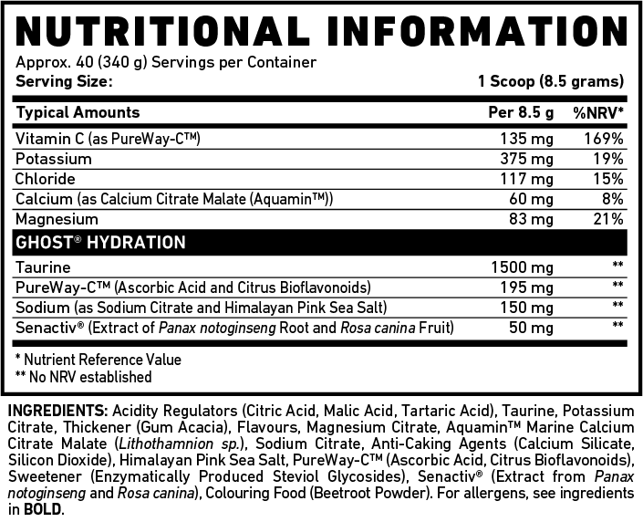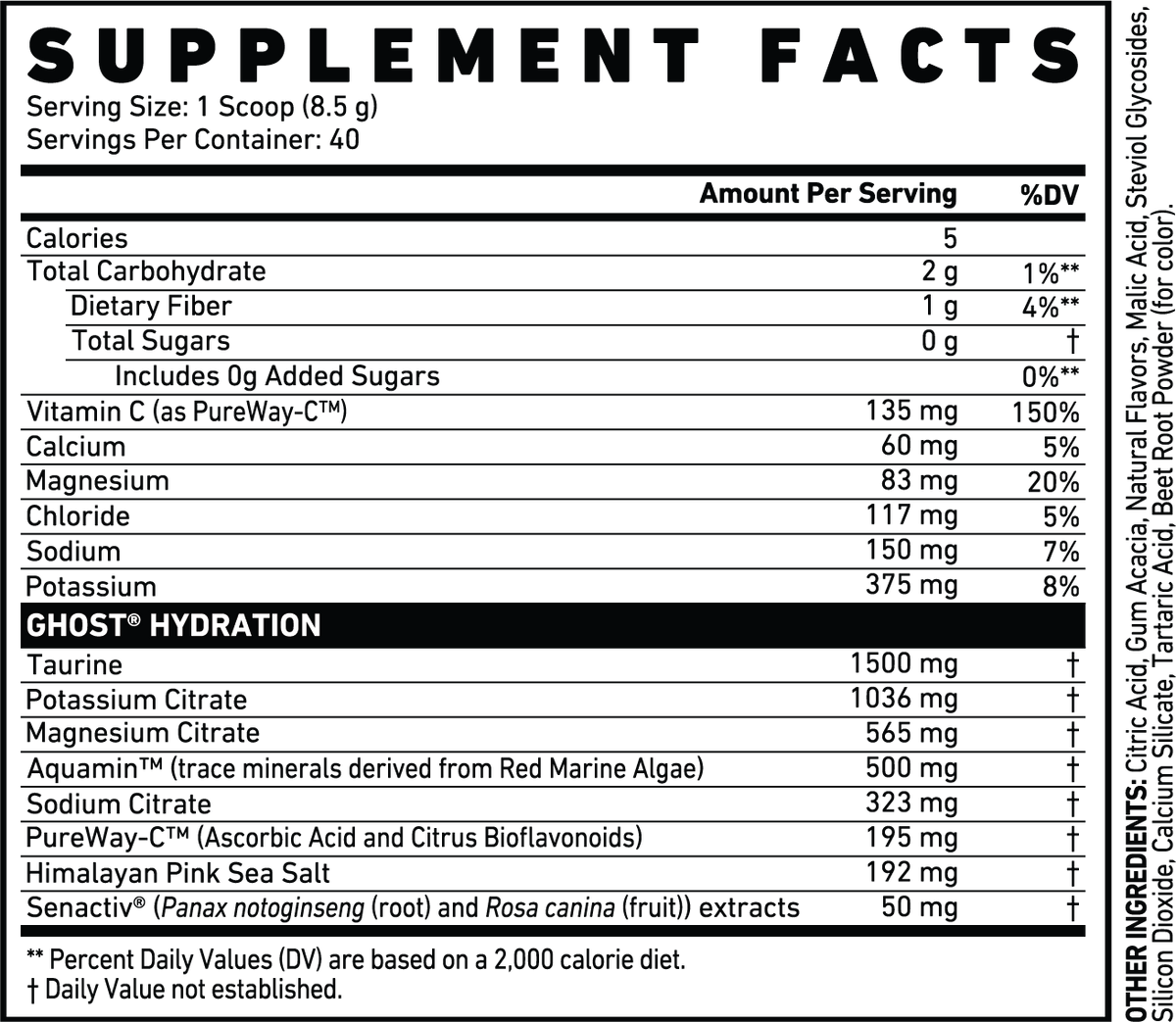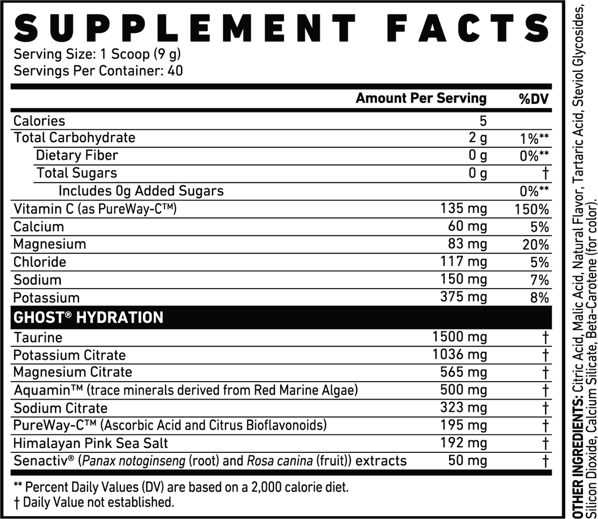 Mix each scoop (serving) of GHOST® Hydration with 350-450 ml of water or beverage of choice. Vary amount of liquid to taste. Consume during or after exercise on training days or throughout the day as an electrolyte thirst quencher.