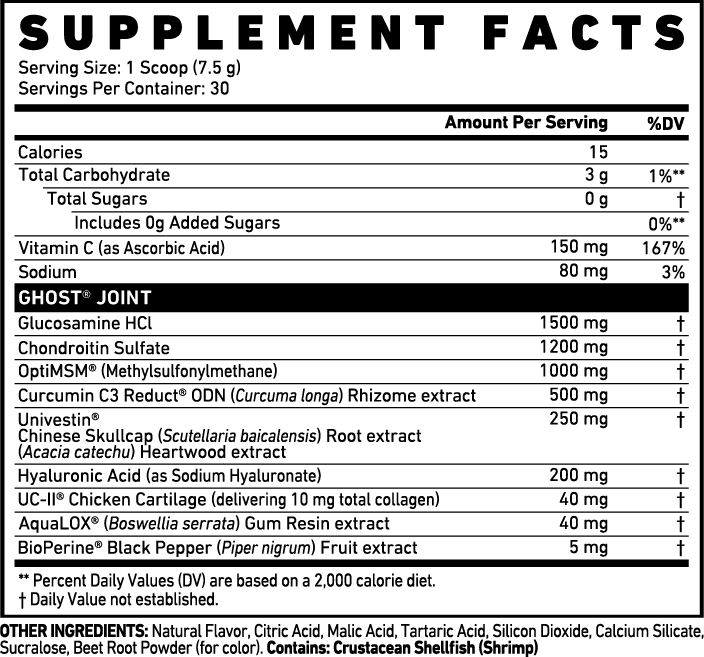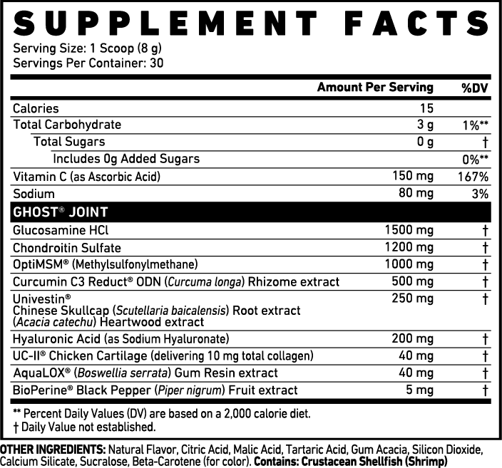 GHOST® JOINT is a food supplement powder with vitamins, amino acids, and herbal extracts with sweetener.