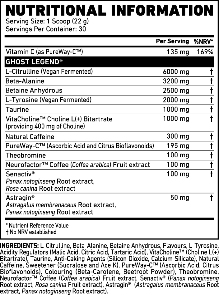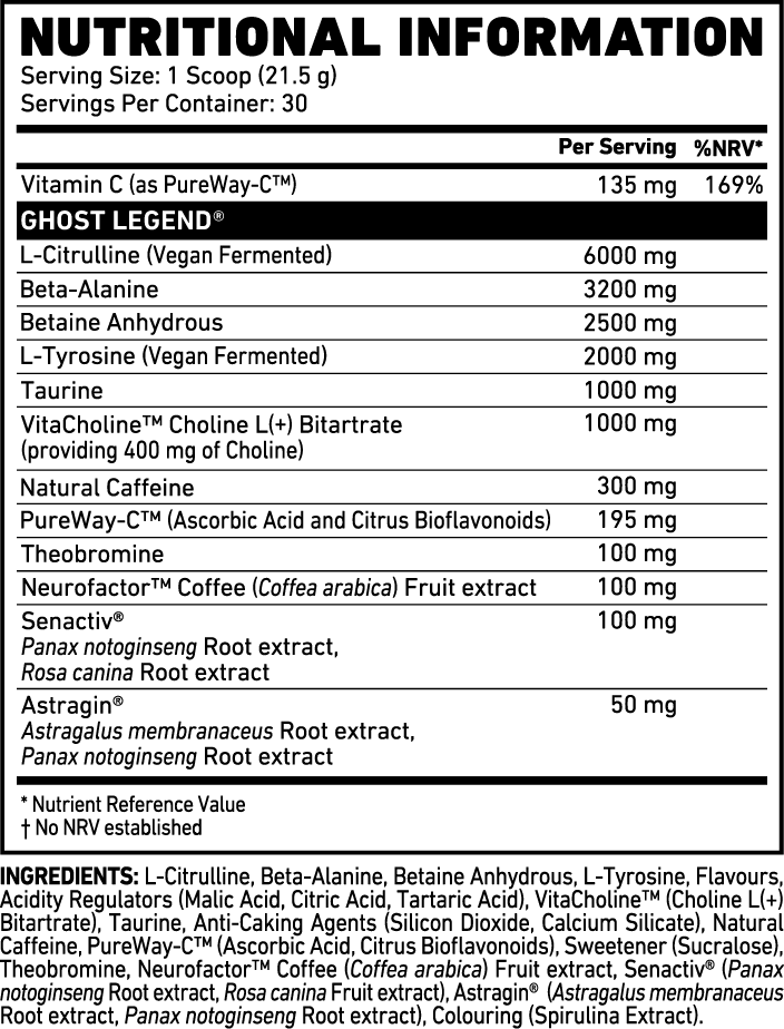 Mix 1 scoop (1 serving) of GHOST LEGEND® with 250-300 ml of water or beverage of choice. Vary amount of liquid to taste. Start with 1/2 scoop to assess your tolerance. Consume prior to exercise on training days.