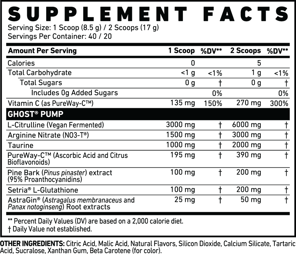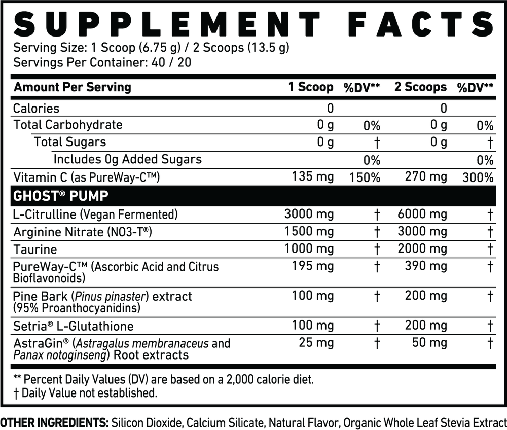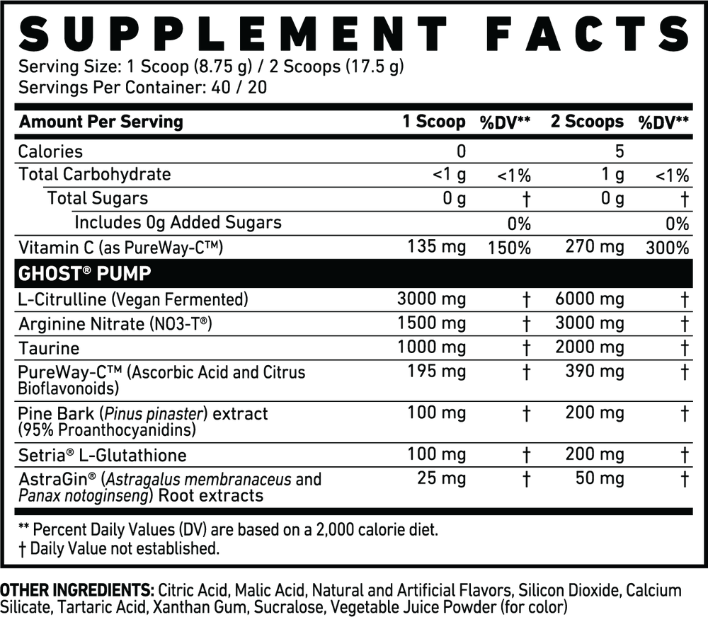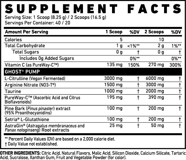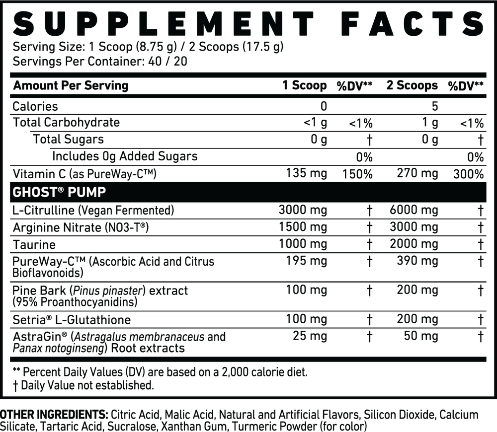 GHOST® PUMP is a food supplement powder with vitamins, amino acids, and herbal extracts with sweetener.
