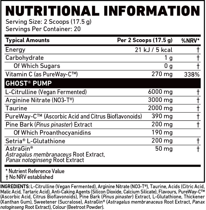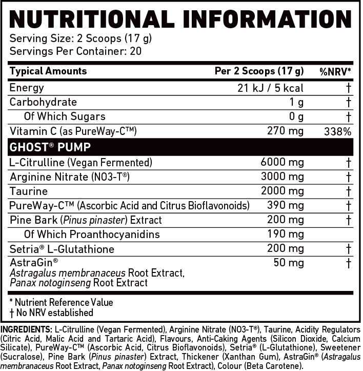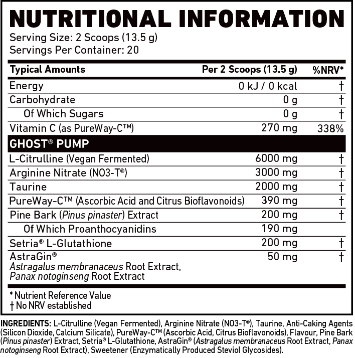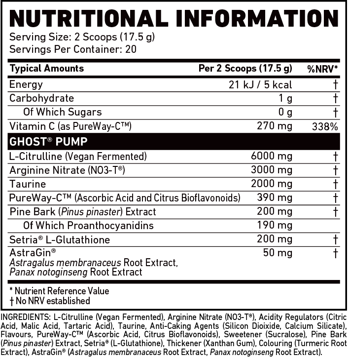 GHOST® PUMP is a food supplement powder with vitamins, amino acids, and herbal extracts with sweetener.